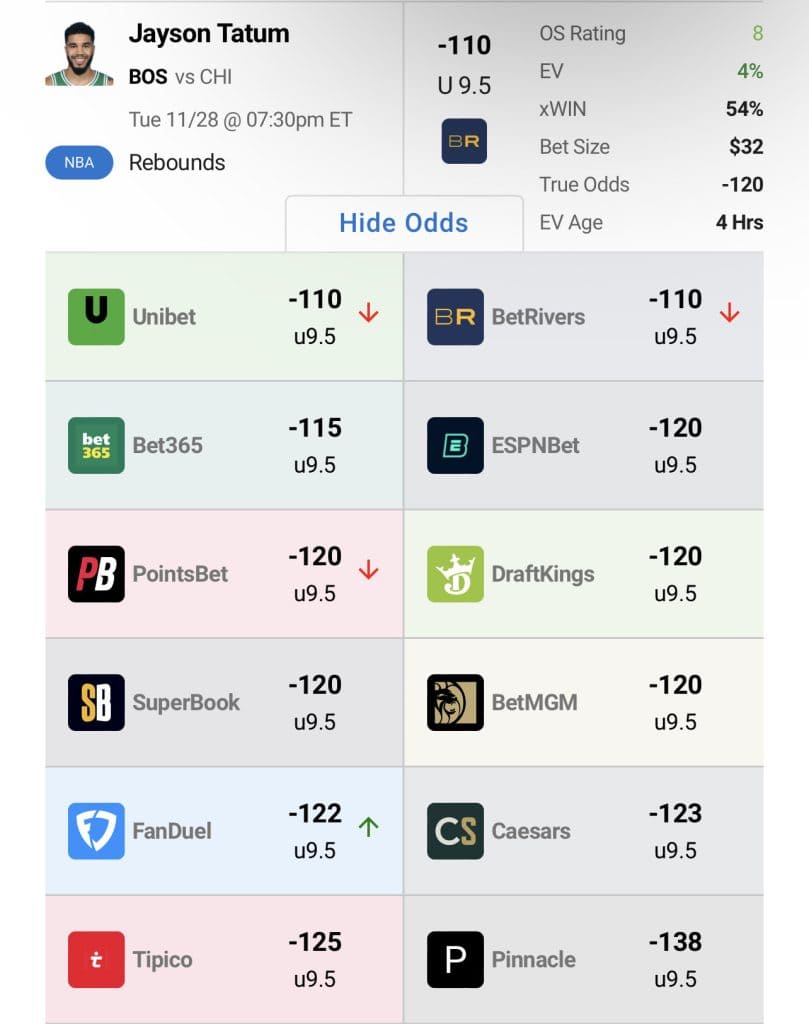 From an EV standpoint, BetRivers remains at the top of the list in +EV player props. They’ve listed Tatum at under 9.5 rebounds at -110, while the major books have vig on the under. Even at -120 on DraftKings, this player prop is still in play for a full unit if you want to join in on the fun.