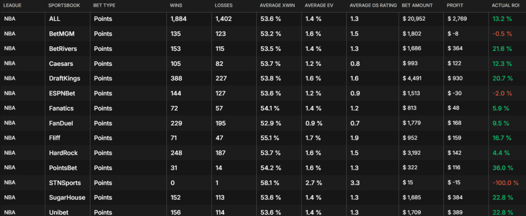 BetRivers and DraftKings scoring props have been especially strong, returning over 20%, while Fanatics points props, though more modest at 5%, still provide a positive edge. The Keon Johnson Fanatics bet in particular has an excellent 7.4% historical ROI.
