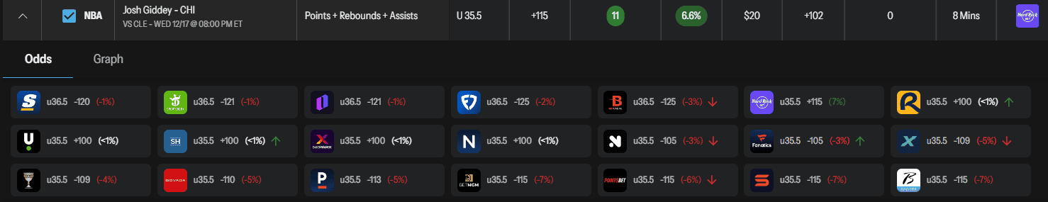 DraftKings moved the threshold up to 36.5 PRA, though we can see that the -121 line is still a slightly negative expected ROI but well below Hard Rock’s offering. For the books also offering under 35.5 PRA, BetMGM’s -115 is actually a NEGATIVE 6.3% expected ROI when looking at the “true odds” of +102. It pays to be a savvy shopper!