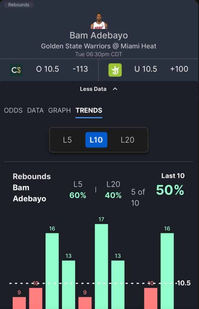So, we’re firing up the over on Bam Adebayo 10.5 rebounds tonight against the Golden State Warriors.