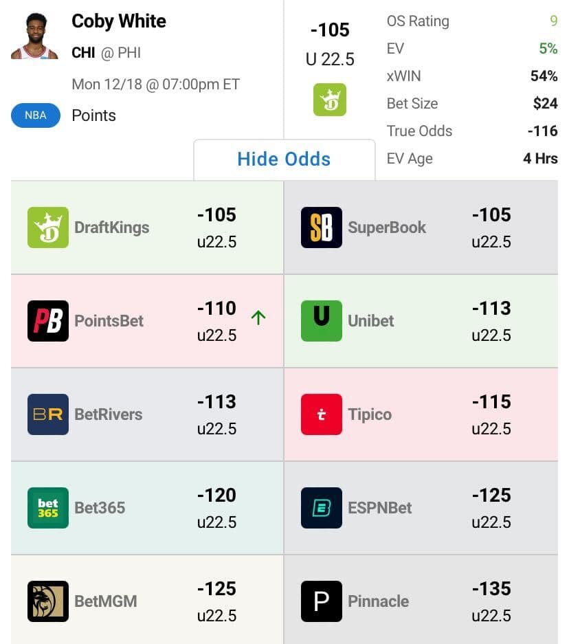 OddsShopper’s betting model found another pricing disparity in the odds from this Bulls-76ers game. Coby White is -105 on DraftKings to stay under 22.5 points, below the True Odds of -116 and far below the -135 odds at Pinnacle, a sharp book. That makes this wager on White a +EV Bet. For the rest of our model’s projections — more than just the NBA — subscribe to OddsShopper Premium!
