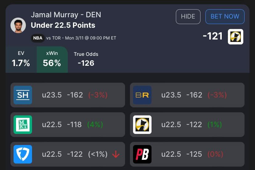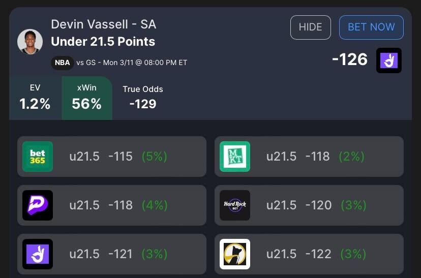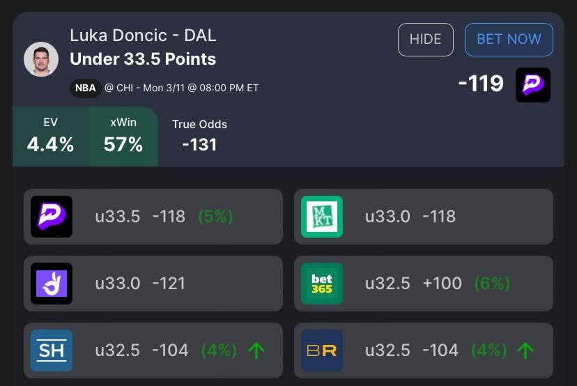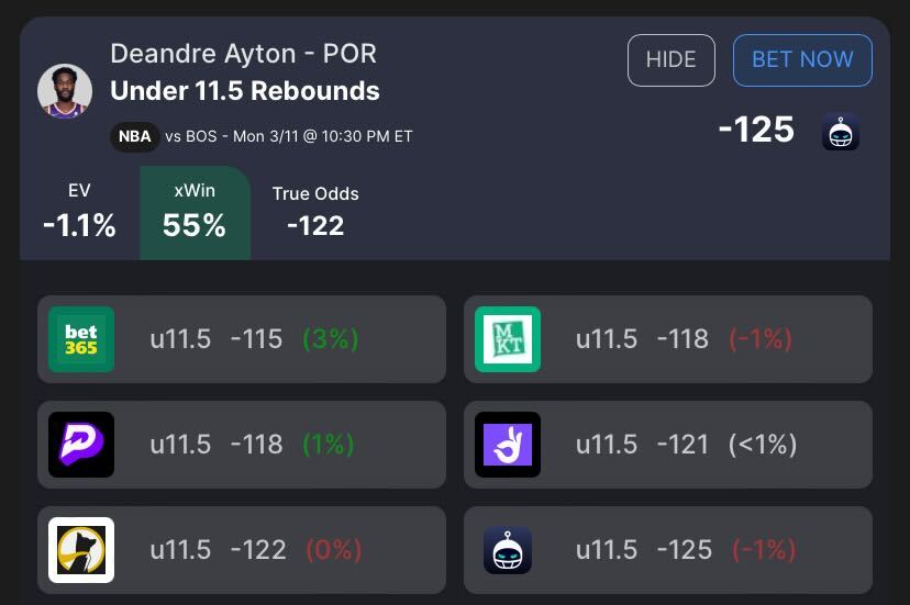 Sleeper Fantasy is different from other pick’em sites in that they assign multipliers for each pick rather than site-wide implied odds. That makes it tough to land +EV picks — today is no exception. However, Ayton less than 11.5 rebounds is the closest, with a 55% win rate on a passable 1.72x multiplier (-125 implied odds vs. -122 True Odds).