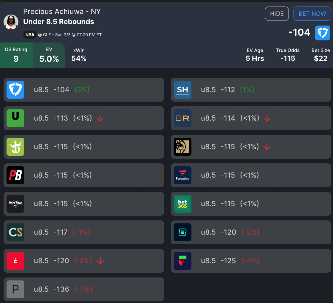 Our NBA betting tools are showing the true odds for Achiuwa’s rebounding under at -115. Bettors can gain an edge on the books if they place this bet at FanDuel, listed at -104. Meanwhile, Pinnacle, a sharp book, lists the under 8.5 rebounds for -136, a massive discrepancy. OddsShopper calculates true odds by indexing odds available at all books and adjusting for book sharpness and hold.