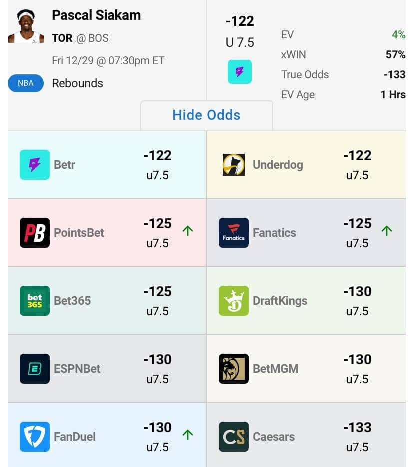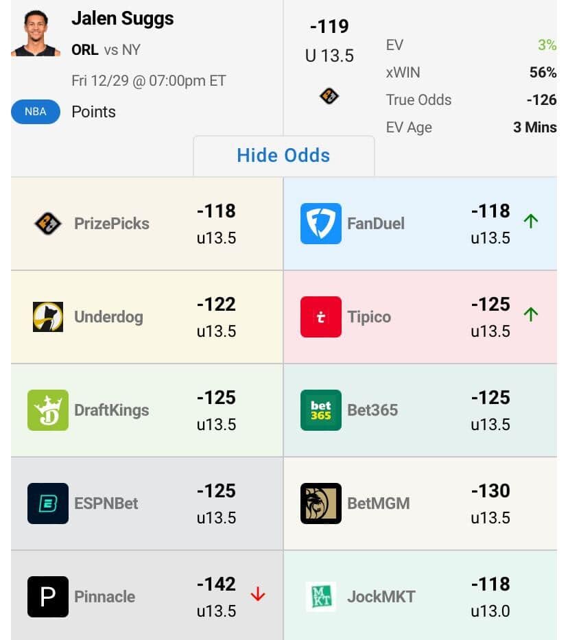 Are you having trouble making progress with your NBA pick’em plays? Well, we have the answer for you, and you can start seeing an upswing in your picks TODAY! Simply sign up with OddsShopper Premium for only $49.95 a month and immediately gain access to all sorts of +EV NBA picks tonight — if you sign up now, make sure to use the promo code CHEATSHEET at checkout to get 20% off! For now, we will give you just a taste of what OddsShopper Premium has to offer for the best DFS apps on Friday, Dec. 29: One pick each from PrizePicks, Sleeper Fantasy, Underdog Fantasy and Betr Picks. We will also show how the picks for each pick’em site compare to projections set by betting markets and other DFS apps so you can see how the value stacks up!