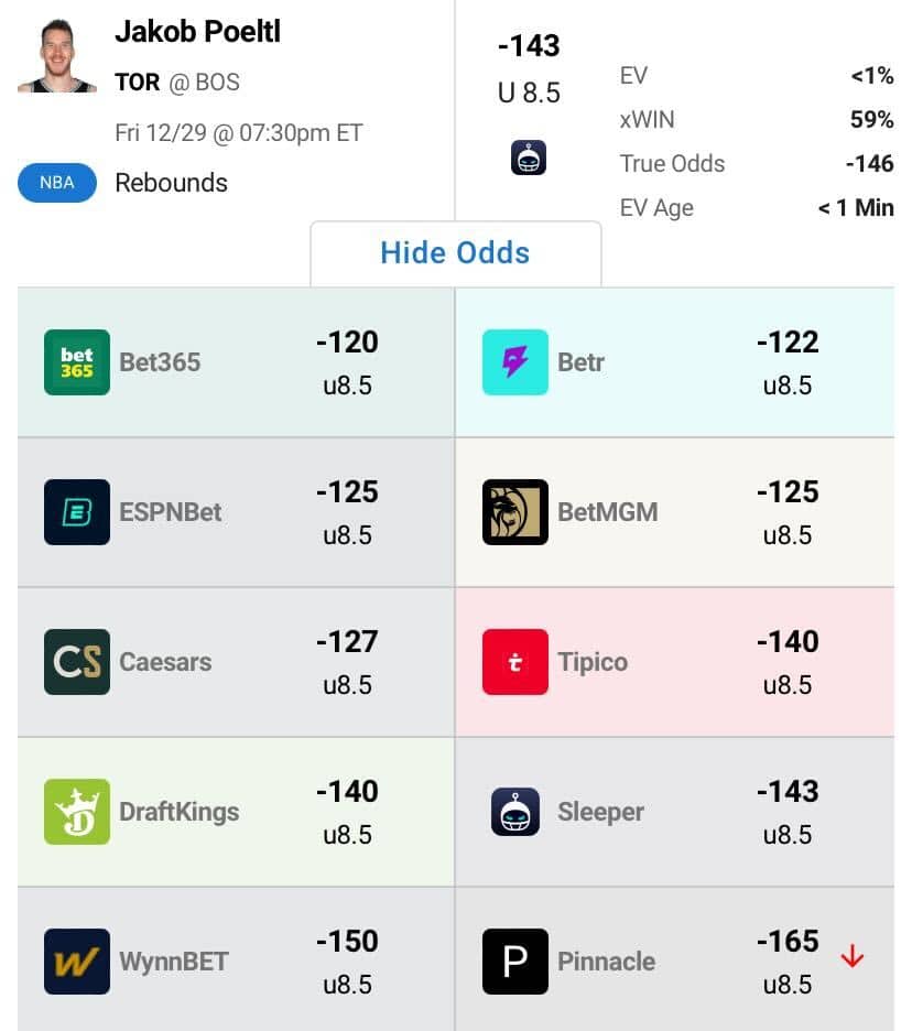 Sleeper is different from other pick’em sites in that they assign multipliers for each pick rather than site-wide implied odds. That makes it tough to land +EV picks. However, today we actually have one, with Poeltl less than 8.5 rebounds getting a 59% win rate on a passable multiplier of 1.7x (-143 implied odds), making its True Odds -146 and thus its EV a hair under 1%.