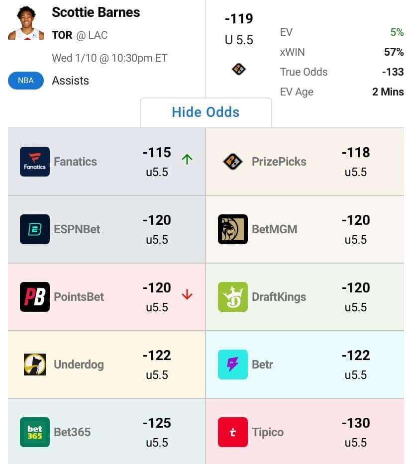Are you having trouble making progress with your NBA pick’em plays? Well, we have the answer for you, and you can start seeing an upswing in your picks TODAY! Simply sign up with OddsShopper Premium for only $49.95 a month and immediately gain access to all sorts of +EV NBA picks tonight — if you sign up now, make sure to use the promo code CHEATSHEET at checkout to get 20% off! For now, we will give you just a taste of what OddsShopper Premium has to offer for the best DFS apps on Wednesday, Jan. 10: One pick each from PrizePicks, Sleeper Fantasy, Underdog Fantasy and Betr Picks. We will also show how the picks for each pick’em site compare to projections set by betting markets and other DFS apps so you can see how the value stacks up!