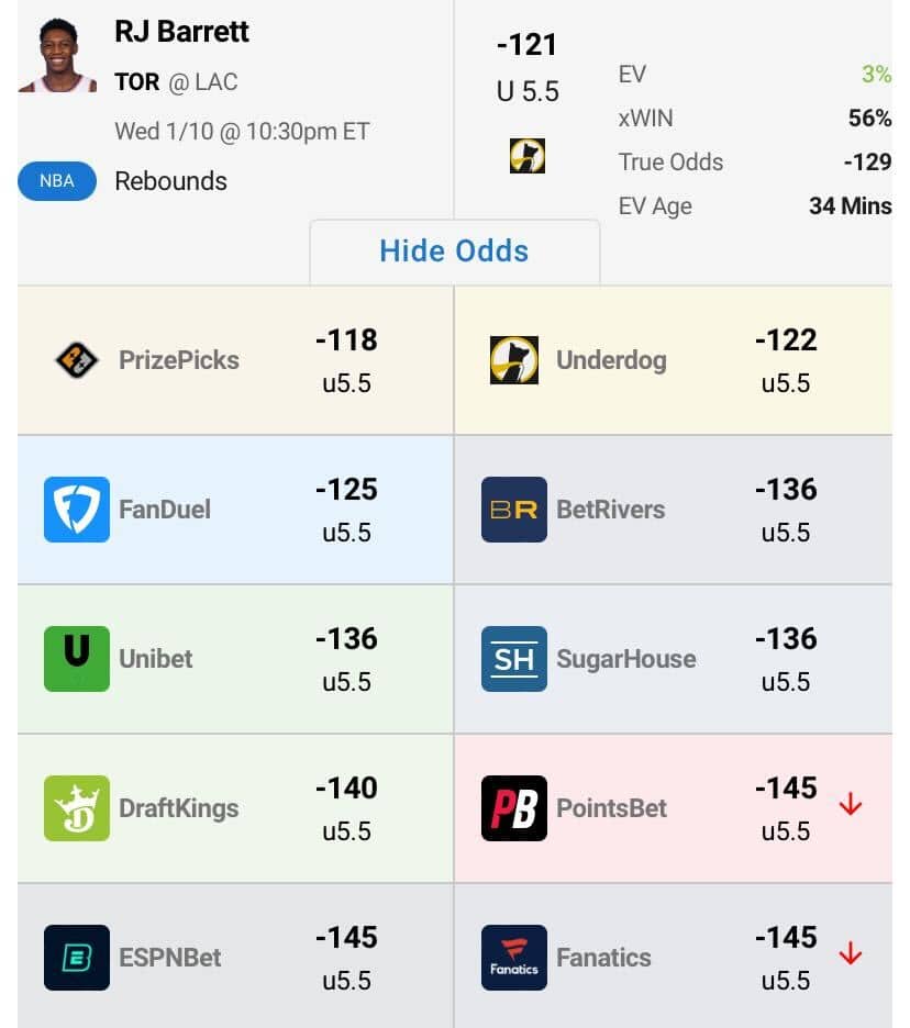 Betr Picks is close to Underdog in the implied odds department, going -122 across the app. Ivey less than 20.5 points has an expected winning percentage of 56%, which is giving it -128 True Odds. Given the Betr Picks odds, that makes this play +EV by 2%.