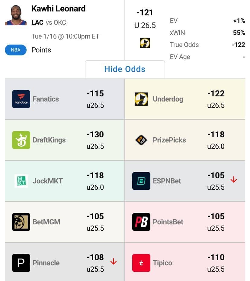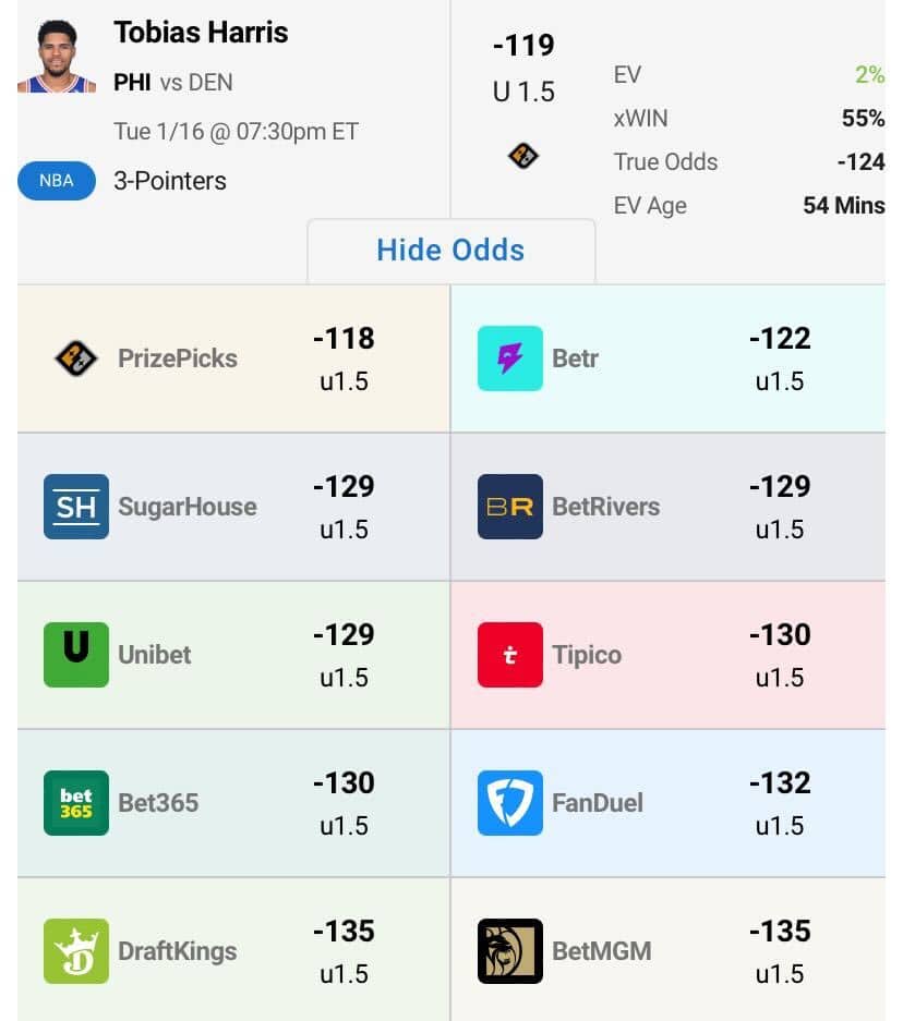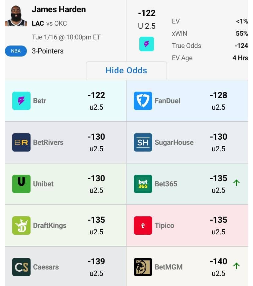 Betr Picks is close to Underdog in the implied odds department, going -122 across the app. Harden less than 2.5 3-pointers has an expected winning percentage of 55%, which is giving it -124 True Odds. Given the Betr Picks odds, that makes this play +EV by about 1%.