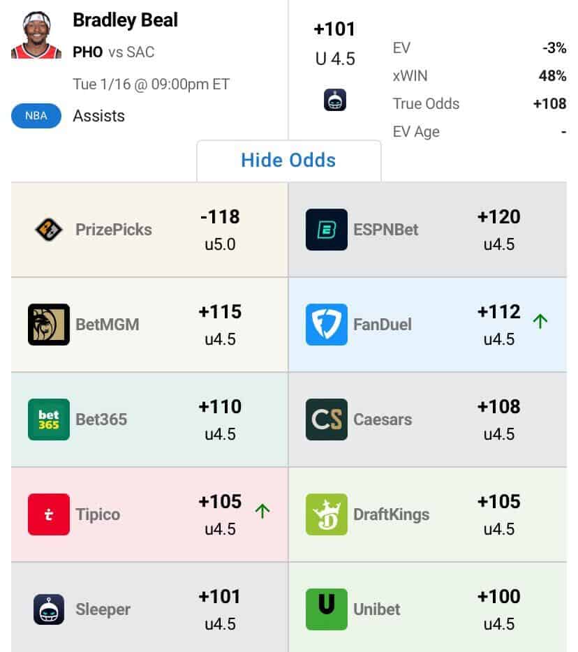 Sleeper is different from other pick’em sites in that they assign multipliers for each pick rather than site-wide implied odds. That makes it tough to land +EV picks — today is no exception. However, Beal less than 4.5 assists has a huge 2.01x multiplier to create +101 implied odds. With the True Odds not far off at +108, the play is negative by only 3%.