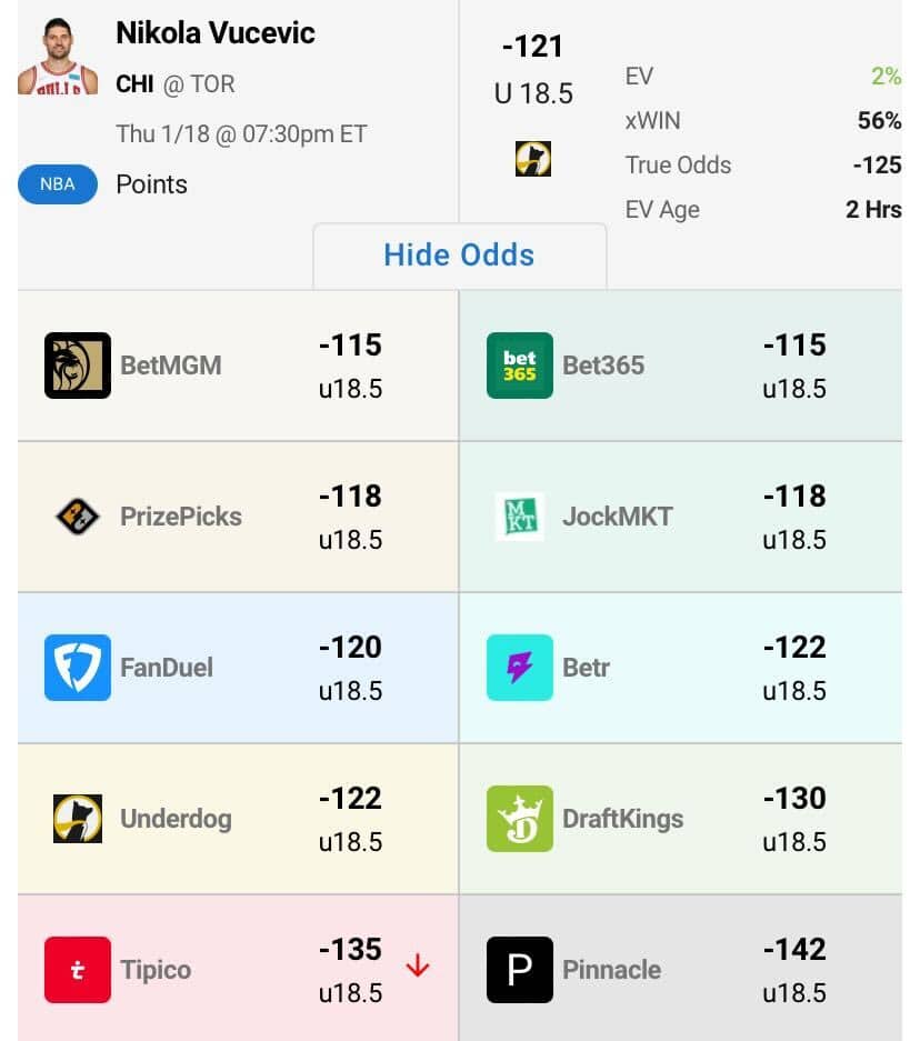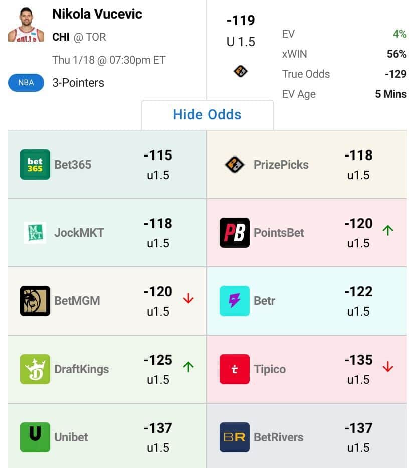 Are you having trouble making progress with your NBA pick’em plays? Well, we have the answer for you, and you can start seeing an upswing in your picks TODAY! Simply sign up with OddsShopper Premium for only $49.95 a month and immediately gain access to all sorts of +EV NBA picks tonight — if you sign up now, make sure to use the promo code CHEATSHEET at checkout to get 20% off! For now, we will give you just a taste of what OddsShopper Premium has to offer for the best DFS apps on Thursday, Jan. 18: One pick each from PrizePicks, Sleeper Fantasy, Underdog Fantasy and Betr Picks. We will also show how the picks for each pick’em site compare to projections set by betting markets and other DFS apps so you can see how the value stacks up!