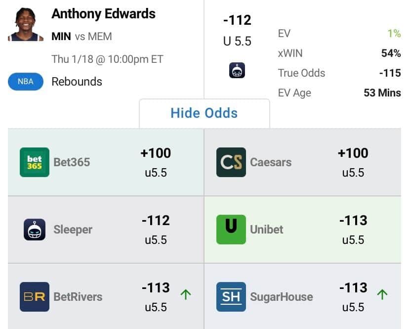 Sleeper is different from other pick’em sites in that they assign multipliers for each pick rather than site-wide implied odds. That makes it tough to land +EV picks. However, today we do have a positive play; Edwards less than 5.5 rebounds has a strong 1.89x multiplier to create -112 implied odds. With the True Odds at -115, the play is +EV by 1%.