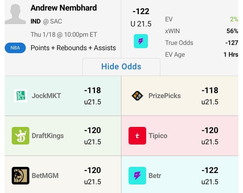 Betr Picks is close to Underdog in the implied odds department, going -122 across the app. Nembhard less than 21.5 points + rebounds + assists has an expected winning percentage of 56%, which is giving it -127 True Odds. Given the Betr Picks odds, that makes this play +EV by 2%.