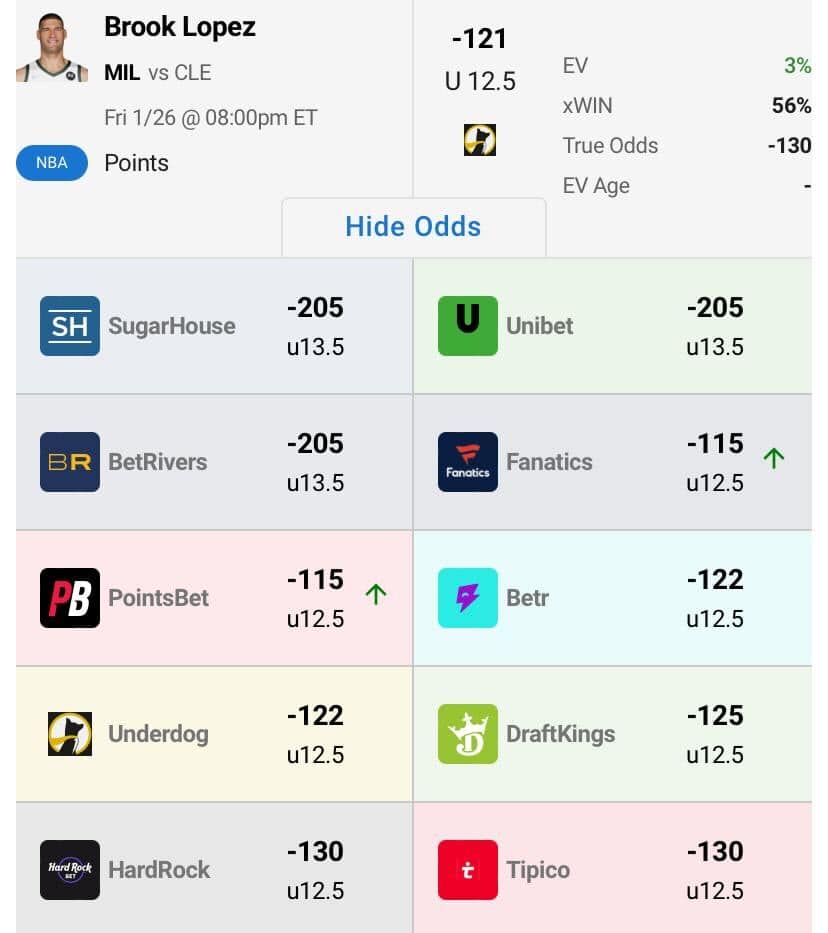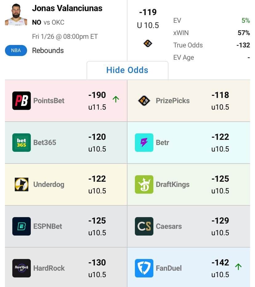 Are you having trouble making progress with your NBA pick’em plays? Well, we have the answer for you, and you can start seeing an upswing in your picks TODAY! Simply sign up with OddsShopper Premium for only $49.95 a month and immediately gain access to all sorts of +EV NBA picks tonight — if you sign up now, make sure to use the promo code CHEATSHEET at checkout to get 20% off! For now, we will give you just a taste of what OddsShopper Premium has to offer for the best DFS apps on Friday, Jan. 26: One pick each from PrizePicks, Sleeper Fantasy, Underdog Fantasy and Betr Picks. We will also show how the picks for each pick’em site compare to projections set by betting markets and other DFS apps so you can see how the value stacks up!
