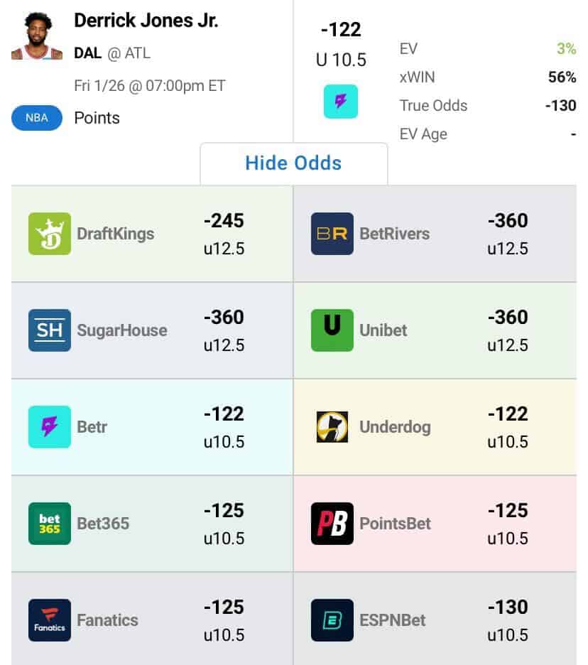 Betr Picks is close to Underdog in the implied odds department, going -122 across the app. Jones less than 10.5 points has an expected winning percentage of 56%, which is giving it -130 True Odds. Given the Betr Picks odds, that makes this play +EV by a whopping 3%.