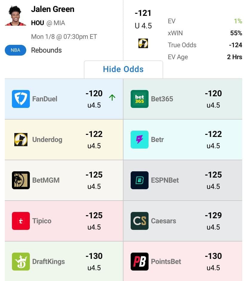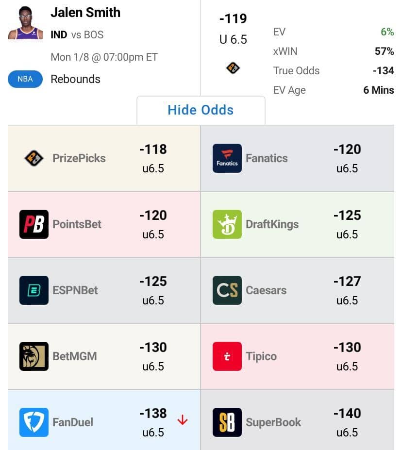 Betr Picks is close to Underdog in the implied odds department, going -122 across the app. Rozier less than 24.5 points has a strong expected winning percentage of 57%, which is giving it -132 True Odds. Given the Betr Picks odds, that makes this play +EV by 3%.