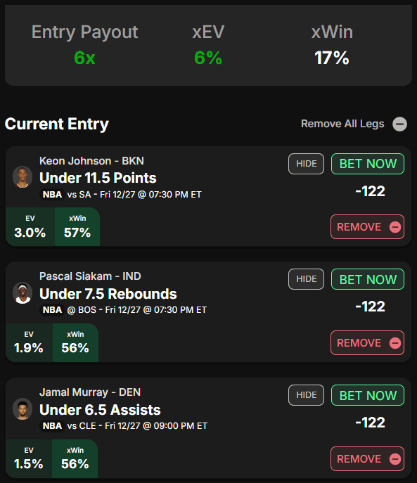 This puts the total Underdog NBA entry at a 17% chance of hitting a 6x Standard play — that’s 6% +EV. Be sure to check out our Underdog Fantasy Optimizer for more +EV NBA expert picks!