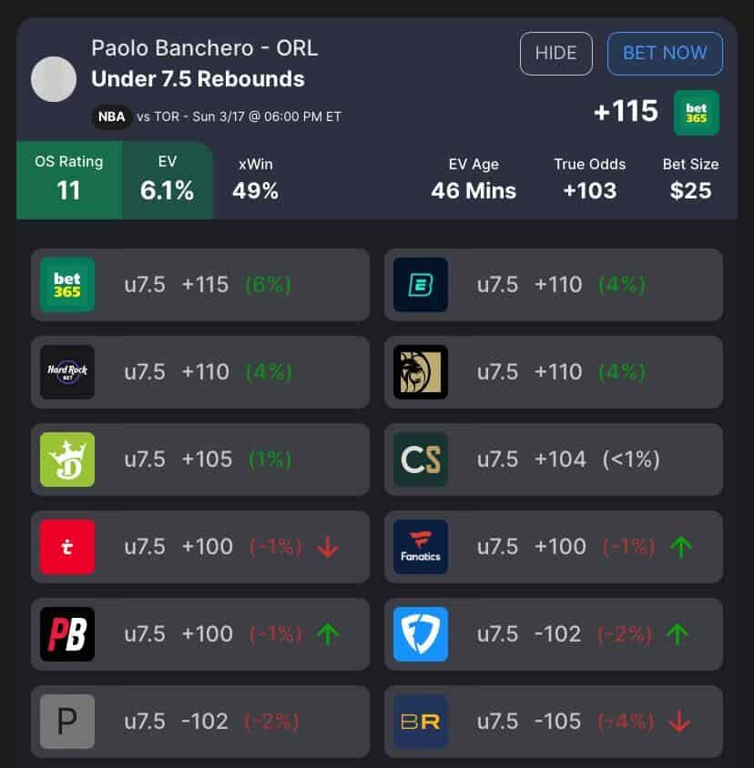 This bet is all about value and the market. There are actually a number of spots where OddsShopper finds the odds attractive, as the Premium model has the True Odds on Banchero under 7.5 rebounds at +103. That means anything shorter than that is +EV, and a few are up at +110. Bet365 is best, though, with +115 odds making it positive by over 6% and the No. 1 prop on the board right now.