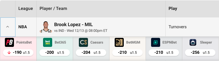 Using OddsShopper’s Positive EV Bets tool, we see that all other operators have the less juiced between -190 and -210, giving this a 64% expected win rate. In the two matchups with Indiana this season, he’s recorded zero and one turnover. Trust the tool and the numbers here and go with less than for Lopez.