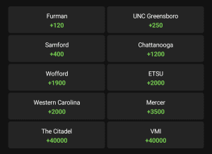 Furman (+120) opens as the favorites to win the SoCo tournament. They are trailed by UNC Greensboro (+250), Samford (+400) and Chattanooga (+1200). Furman, Samford and Chattanooga are the top three overall seeds in the brackets and will receive first-round byes. The other first-round bye belongs to Western Carolina (+2000).