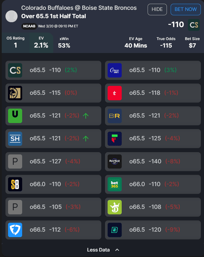 OddsShopper’s college basketball betting tools advise that you get some money down on this Colorado-Boise State first-half total before the value gets bid off the board by sharp bettors.