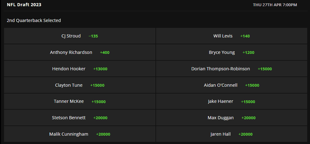 Still, I think it’s hard to get excited about drafting a quarterback who couldn’t beat the Vanderbilt Commodores last year, something both Levis and Richardson failed to do. Bettors looking to get action on Stroud to be the second quarterback off the board can do so at DraftKings, where a winning $5 moneyline wager can turn into $150 in bonus bets for new users!
