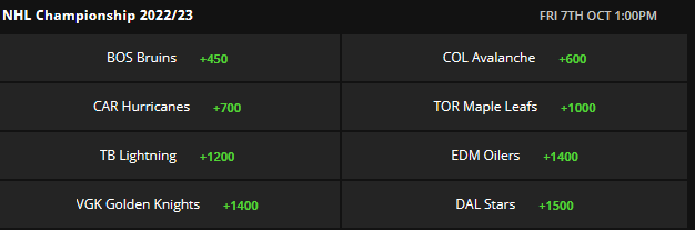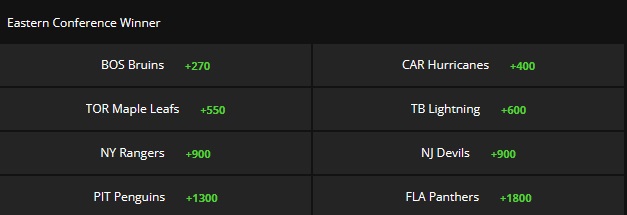 The Bruins have been easily the best team in the NHL through roughly 50 games, recording 83 points and winning over 76% of their games. As such, they are favorites to both come out of the East (+270) and win the Cup (+450). However, the Hurricanes are just behind them in the East odds at +400 despite being 7 points back in the standings.