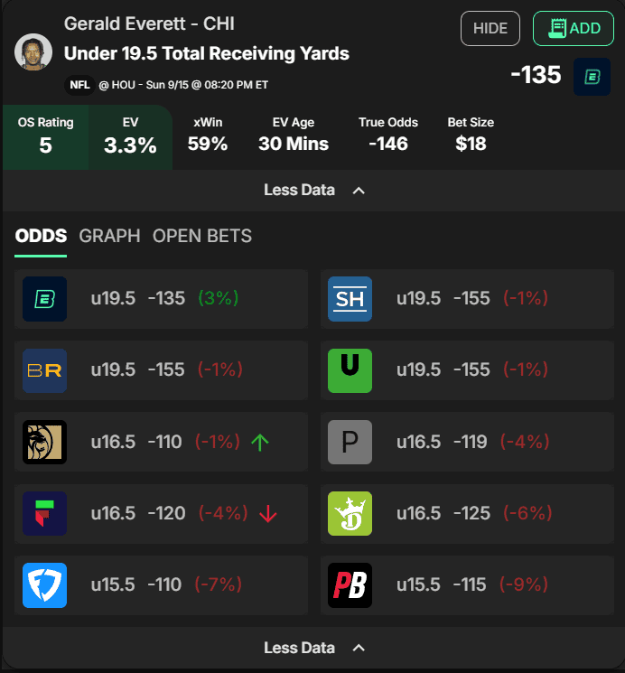 Your NFL player prop strategy (and sports betting strategy more broadly) should be about building a robust portfolio of diversified bets that win more often than they lose. To help you do so, let’s spotlight a featured play from our tools for Gerald Everett.