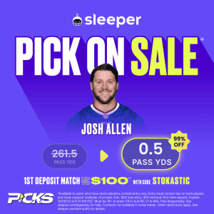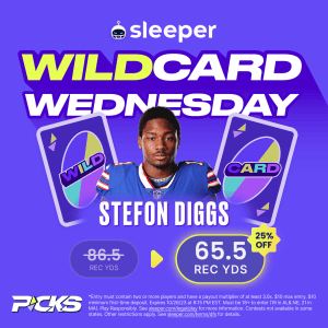New customers are able to get a 99%-off deal on Josh Allen to register at least one passing yard on Thursday Night Football, while ALL players on Sleeper can take advantage of the Wildcard Wednesday offer, in which Stefon Diggs‘ receiving yards line has been discounted down from 86.5 yards to 65.5 yards (25% off).