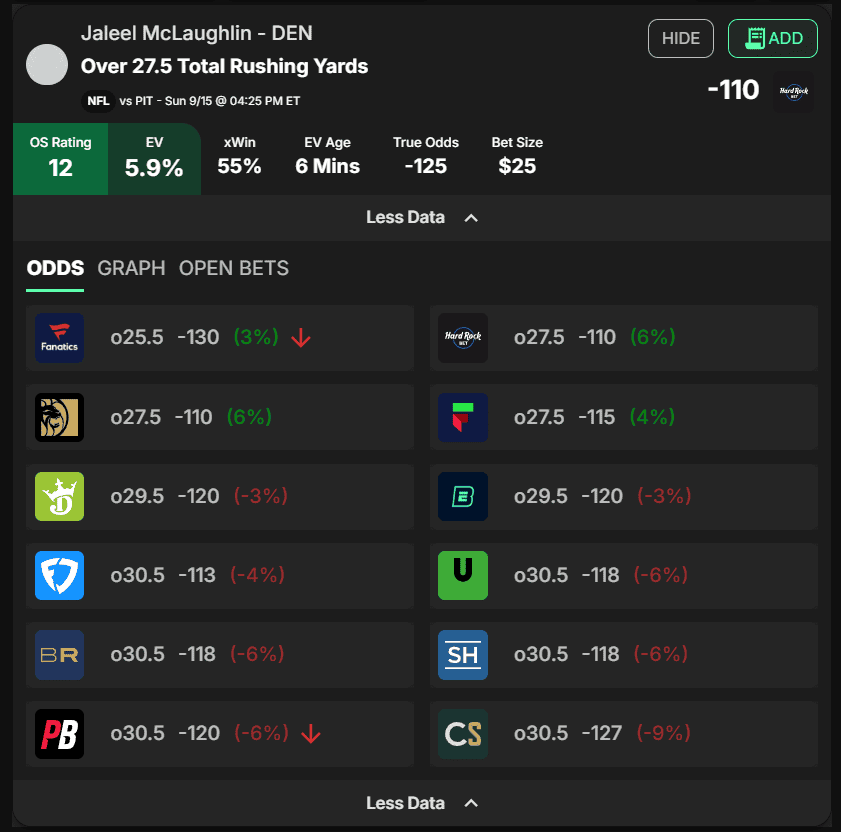 One bet the tools recommend adding to your portfolio: Jaleel McLaughlin over 27.5 total rushing yards. Hard Rock is offering this prop at odds of 27.5 despite most other books listing it at 30.5, and they’re charging less than bigger books are charging for it.