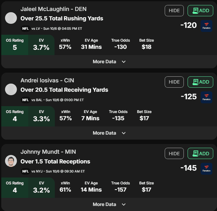 At OddsShopper, our Portfolio EV sports betting tools have gone 542-447 (7% ROI) on all NFL player props with an OS Rating of 2 or higher so far this season. This includes a ridiculous 218-153 (10.8% ROI) on receiving yardage props alone. With our tools, you can get down tons of bets with positive expected value (+EV) quickly.