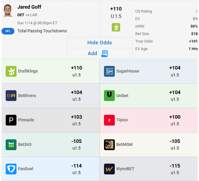 OddsShopper’s betting model has identified this Jared Goff player prop as the highest-value wager in Sunday’s Rams-Lions game. The model works by indexing odds across the market, adjusting for book quality, hold and other factors. The numbers tell us that a bettor with a $1,000 bankroll should wager $18 on this prop. For more +EV wagers, subscribe to OddsShopper Premium today!