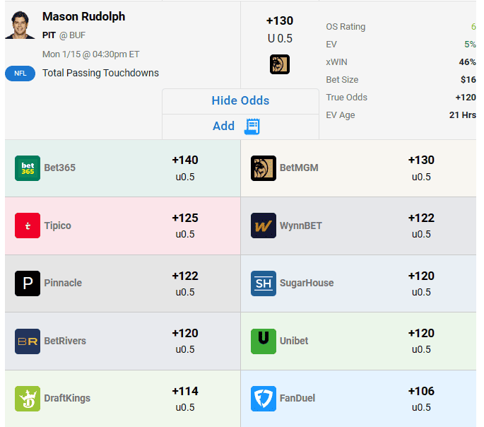 Let’s turn to OddsShopper’s Premium tools for this pick, which is also for Pittsburgh quarterback Mason Rudolph. Rudolph clocks in at odds of +140 at bet365 (and +130 at BetMGM, if you can’t access bet365 in your state) to not throw a touchdown pass. Rudolph went without a passing score in his start versus Seattle but threw at least one touchdown in his other two starts.