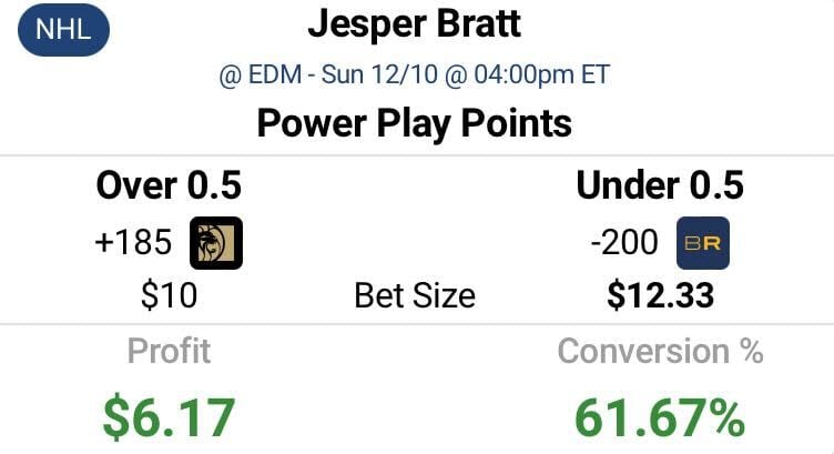 The Free Bet Converter is similar to the Arbitrage Betting tool, only the Free Bet Converter guarantees profitability by specifically targeting sportsbook bonus bets. With today’s play, we will attack Jesper Bratt over 0.5 power play points at BetMGM (+185), then place a 1.233x bet on Bratt under 0.5 power play points at BetRivers (-200). This will lead to a profit of $6.17 on a $10 initial bet. For a full explanation of this process, check out our breakdown here.