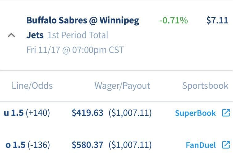 Arbitrage betting in sports is taking advantage of line discrepancies between bookmakers and betting all potential outcomes at different sportsbooks. Regardless of the result, these bets are guaranteed to be profitable since the payout for winning on either side of the bet exceeds the total amount wagered. This bet below pays out $7.11 on a $1,000 bet.