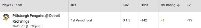 NHL Total: Pittsburgh Penguins vs. Detroit Red Wings First Period Over 1.5 Goals (-142, FanDuel)