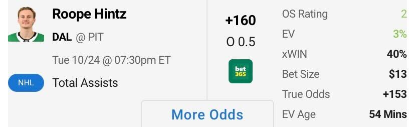 NHL Player Prop: Roope Hintz Over 0.5 Assists (+160, bet365)